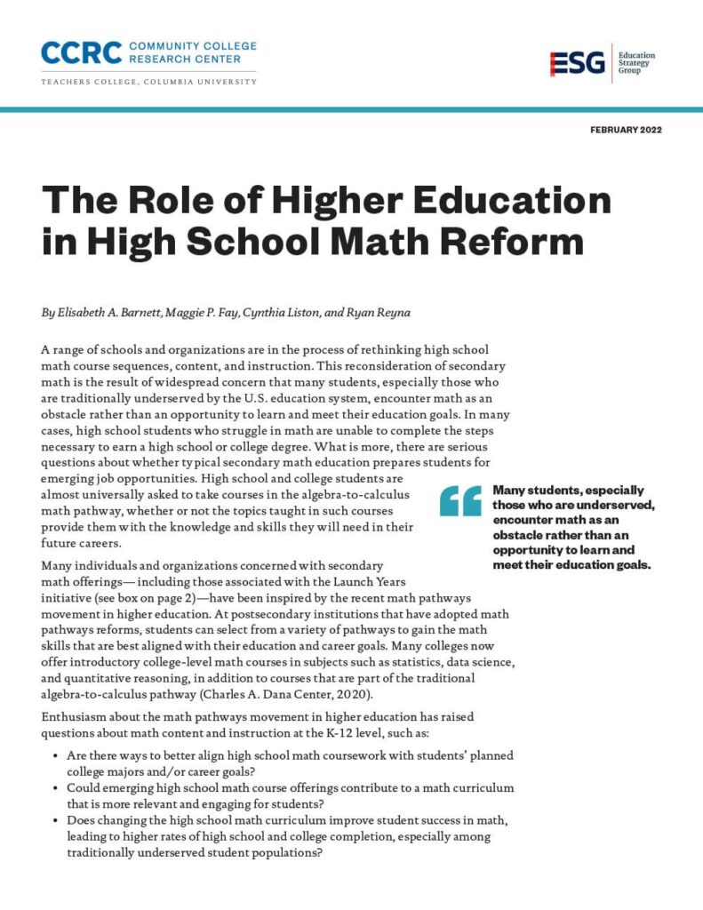 The Role of Higher Education in High School Math Reform By Elisabeth A. Barnett, Maggie P. Fay, Cynthia Liston & Ryan Reyna Change in high school math depends a great deal on policies, practices, and norms at the higher education level. To better understand this topic, researchers from the Community College Research Center (CCRC) and […]