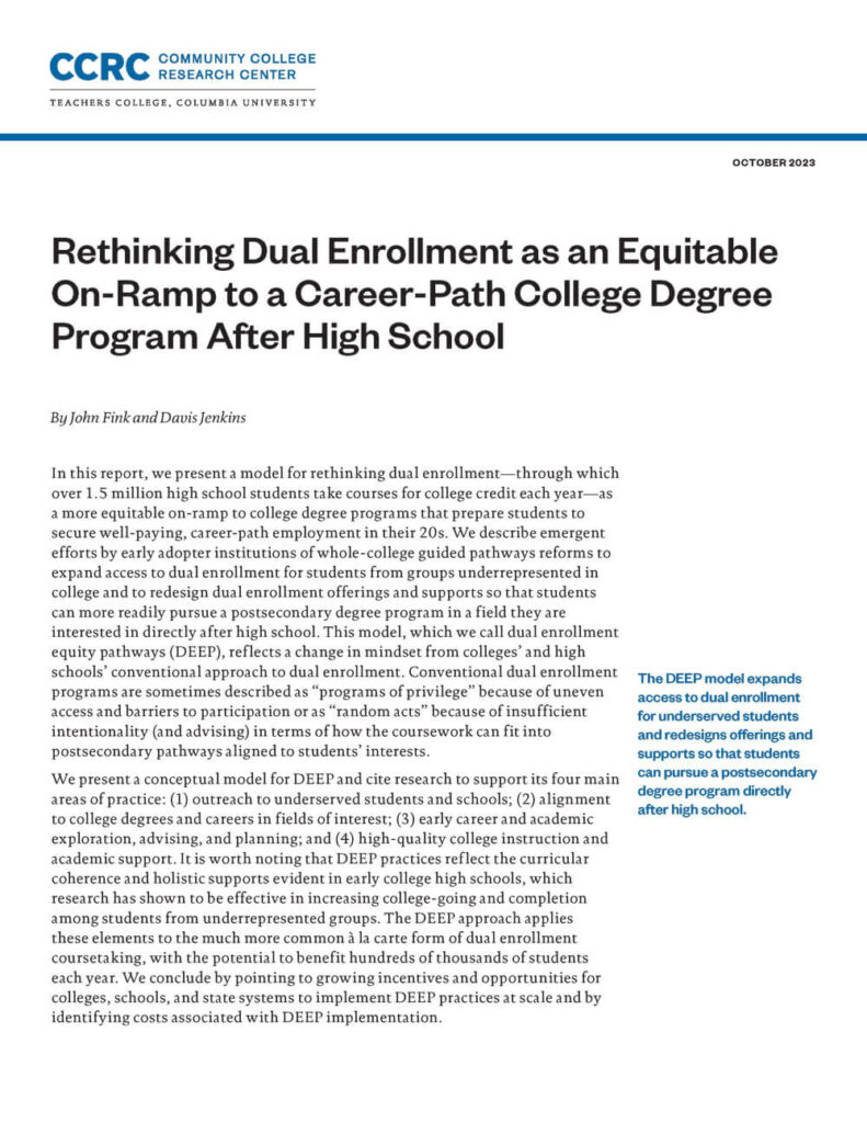 Rethinking Dual Enrollment as an Equitable On-Ramp to a Career-Path College Degree Program After High School By John Fink & Davis Jenkins Dual enrollment (DE), in which high school students take college courses and earn both high school and college credit, has great potential to help make the high-school-to-college transition more effective and equitable—and to […]